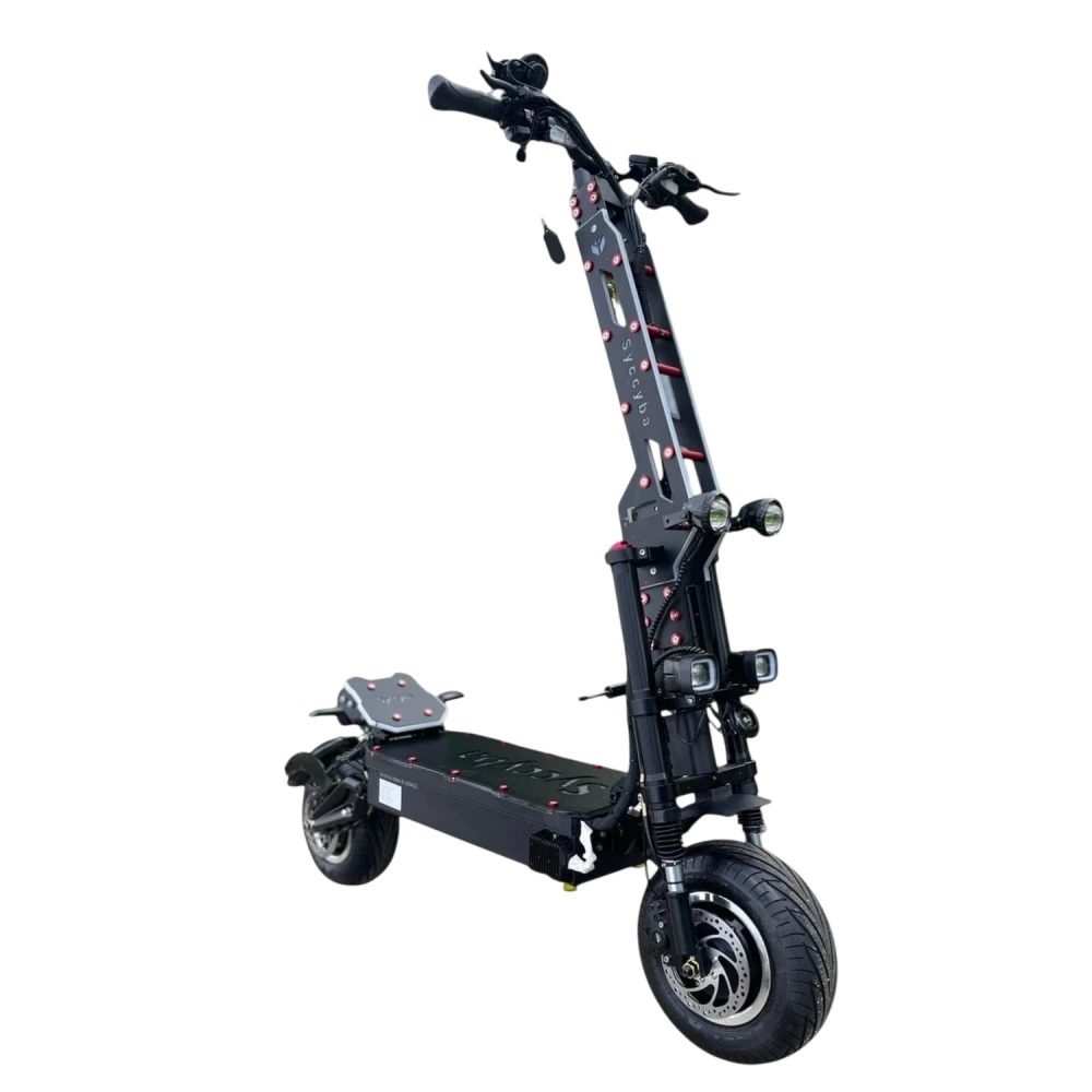 Электросамокат Syccyba Goliaf — полноприводный внедорожник премиум-класса с пиковой мощностью 11000 Вт, максимальной скоростью 110 км/ч, пробегом до 100 км и грузоподъемностью до 150 кг, предназначенный для экстремальной езды по бездорожью.​​