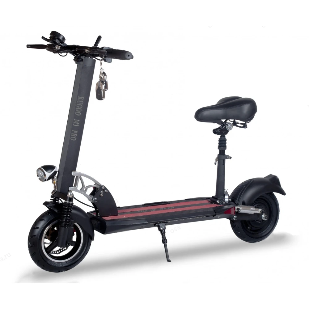 Электросамокат Kugoo M3 PRO второй версии. Усовершенствованная модель M3 PRO. Главным отличием этого агрегата от предыдущего является разное напряжение аккумулятора, в этой модели оно составляет 48 вольт, в электросамокате первой версии было 36 вольт. Модель оснащена масляными амортизаторами заднего колеса, это тоже значительный плюс, на переднем колесе пружинные амортизаторы. Новое крепление сидения, позволяет сложить его в разных положениях. Сидение мягкое, хорошо амортизировано. Агрегат усилен, более грузоподъемный до 150 кг. Гидроизоляция по стандарту IP 54, при использовании в дождь желательно ее дополнить.