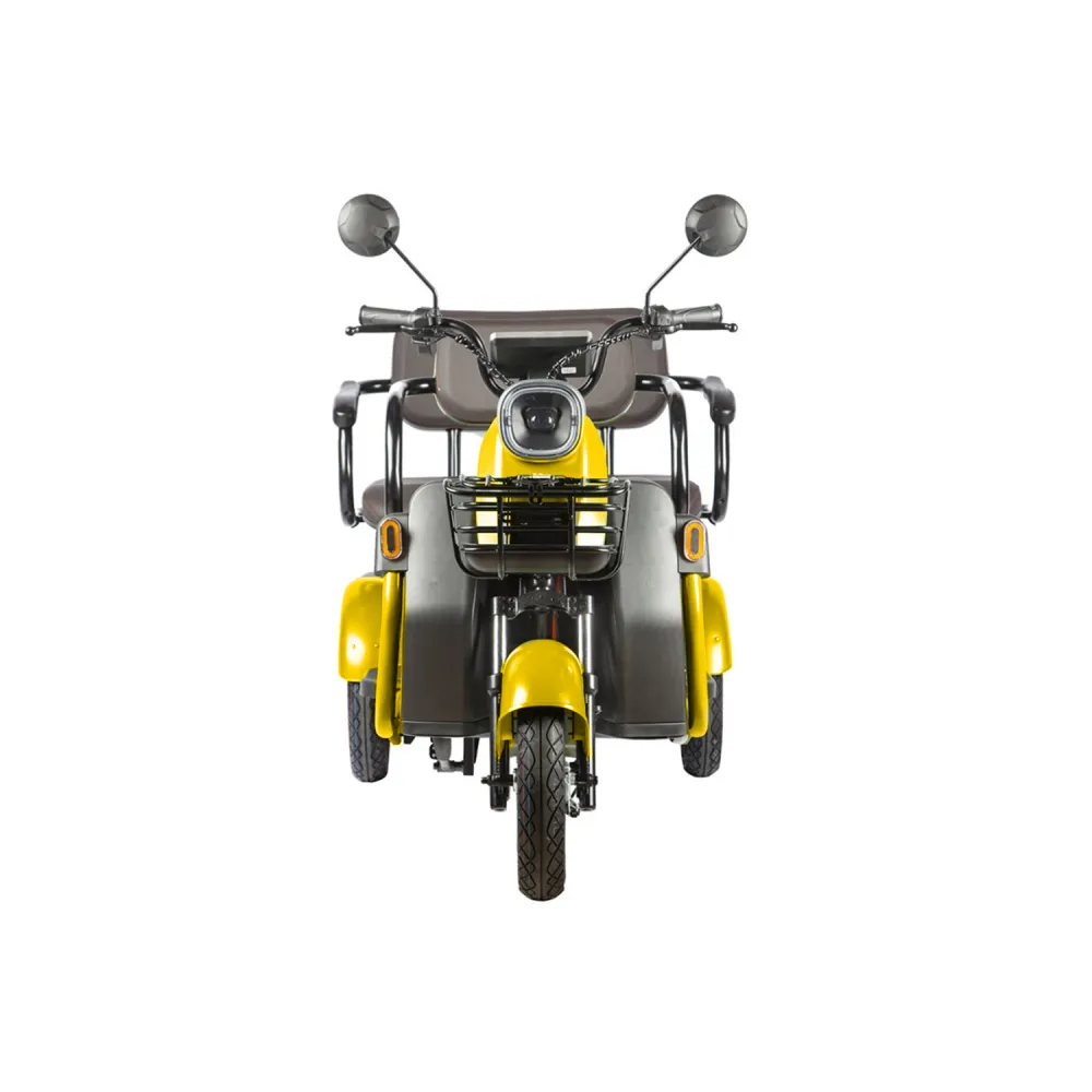 Электротрицикл Rutrike Топик желтый – техника представлена ярким дизайном. Востребована активными целеустремленными личностями, предпочитающими отдых на свежем воздухе. Также модель популярна в частном бизнесе и туристическом сервесе. Стальная конструкция рамы выдерживает максимальную грузоподъемность, не деформируется и не теряет первоначальных характеристик. Комфорт обеспечен широкими сиденьями из эко-кожи. Водительское сиденье анатомическое со спинкой и подлокотниками, исключает усталость и проблемы с позвоночником. В заднем сиденье имеется отсек для груза, может использоваться в качестве багажника. Мягкая платформа исключает отек ног. Мощность электромотора составляет 800 Вт. Батарея в комплектации отсутствует. Производитель предупреждает, что для данной модели трицикла необходимая емкость аккумуляторной батареи составляет 48 В и 60 В. Колесная часть – накатистая, 10-дюймовая, отлично сцепляется с разными видами поверхности. Наличие яркого светодиодного освещения, фирменных тормозов и зеркал заднего вида увеличивает степень безопасности езды, допускает эксплуатацию техники в вечернее время и непогоду. Для приобретения модели оперативно, по приемлемой цене предлагаем прямо сейчас сделать телефонный звонок нашему менеджеру или связаться с ним в чате.