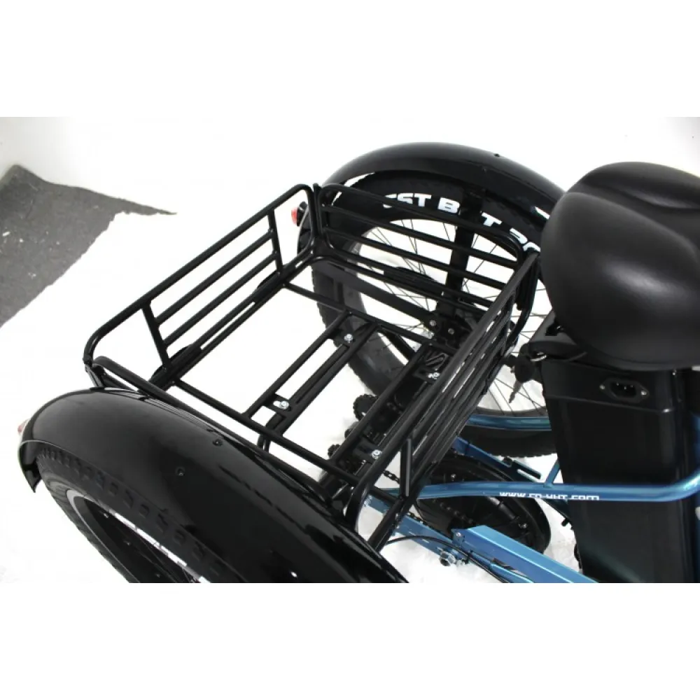 Технические характеристики электровелосипеда позволяют использовать его в пределах городской и сельской местности. Удобные корзины: передняя и задняя предназначены для транспортировки продуктов питания, рюкзака и других полезных для отдыха вещей.