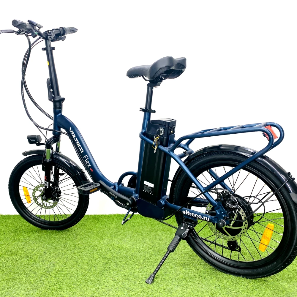 Визуально эта модель электровелосипеда VOLTECO FLEX UP синего цвета очень схожа с обычным. Но на самом деле, это двухколесное средство которое кардинально отличается от своего предшественника. Оснащен электрическим приводом и  аккумулятором. Рама очень легкая так, как выполнена из алюминия. Разработчики производителя позаботились и о таком преимуществе перед автомобилями-полное отсутствие выброса вредных газов в окружающую среду, экономия средств на топливо. Оснащен дополнительным оборудованием, Благодаря которому можно приводить его в движение педалями . Что особенно выгодно для пожилых людей и физически слабых,  которым тяжело крутить педали.