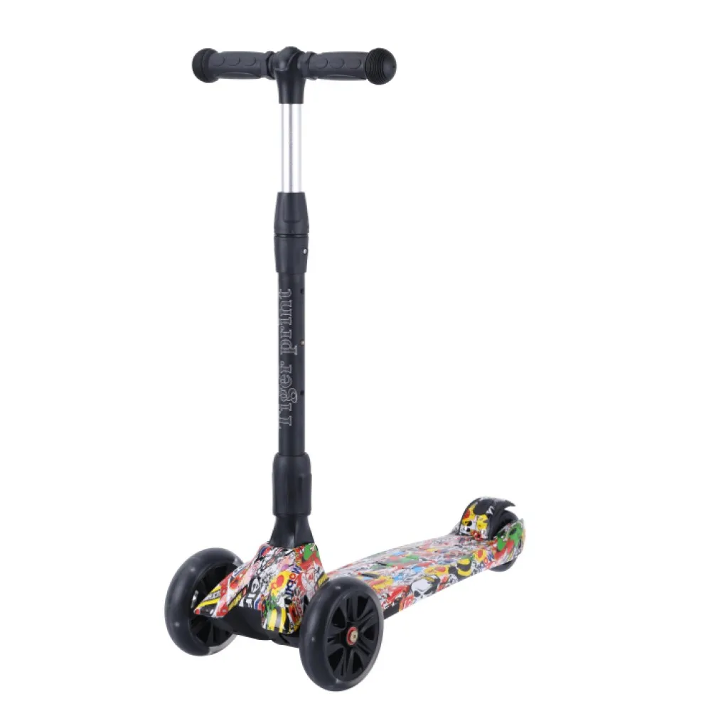Самокат имеет привлекательный современный дизайн. Наличие светодиодной подсветки, загорающейся при движении вызывает радость ребенка и гордость родителей. Параметры телескопического руля регулируются в пределах 65-82 см в 3-х положениях. Чтобы сложить изделие, нужно двумя легкими движениями потянуть деталь.