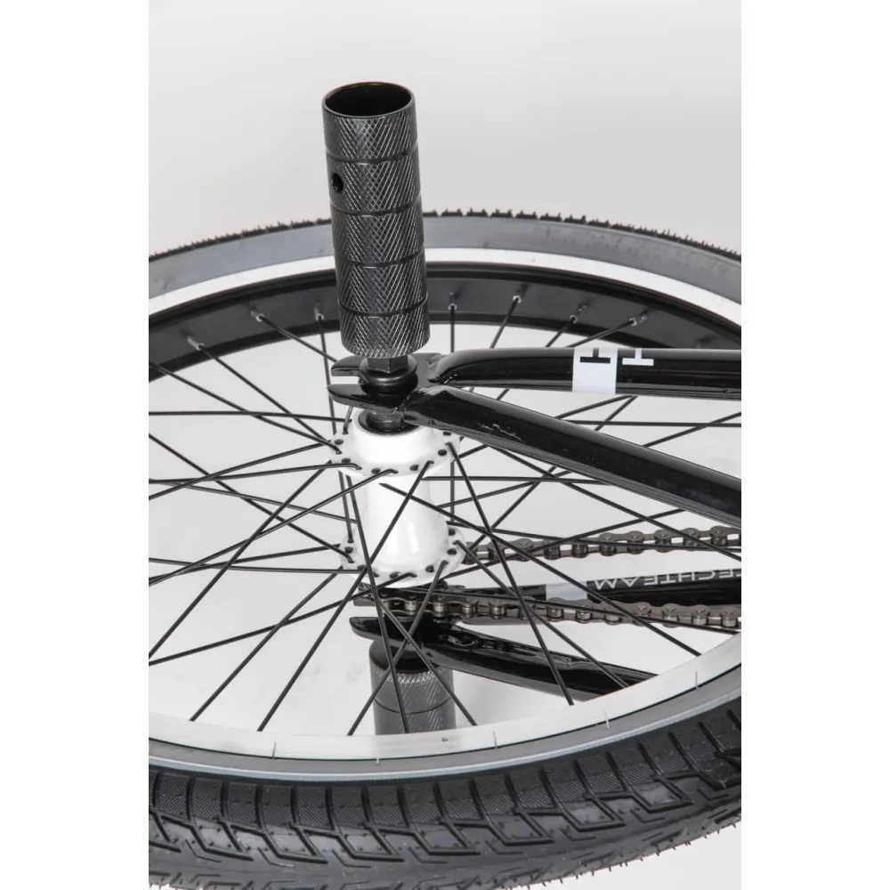 Надежная колесная часть на двойных алюминиевых ободах с накатистой резиной, брендовые покрышки, TT стальной 700 мм руль в сочетании с 4 пегами позволяют ставить трюки по рейлам и делать более серьезные манипуляции.